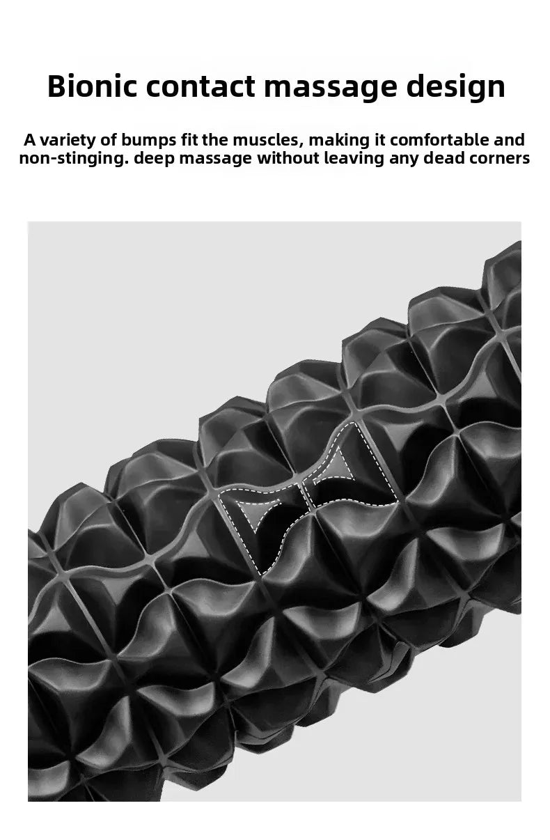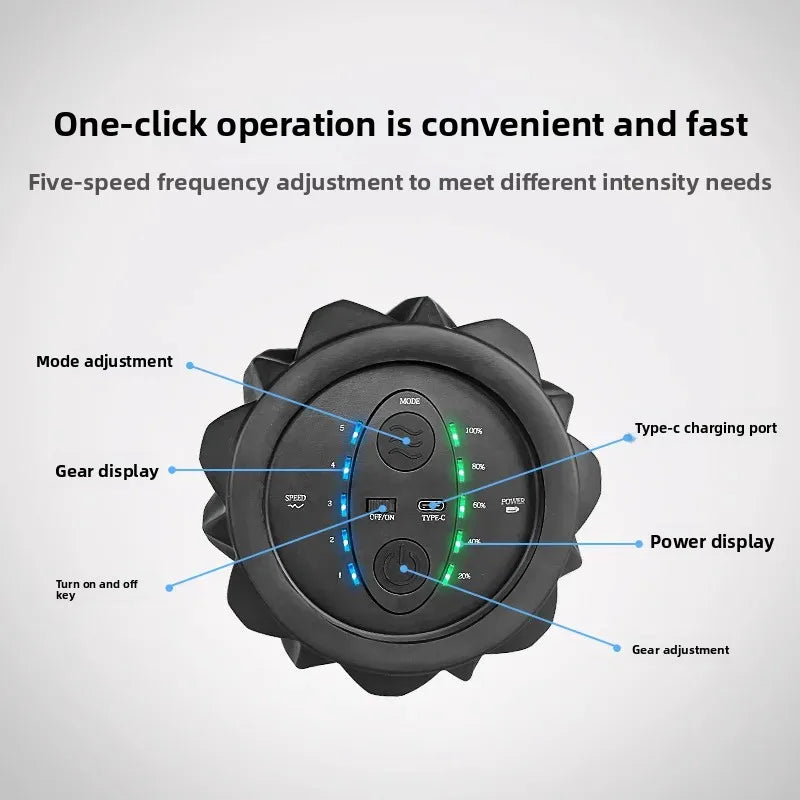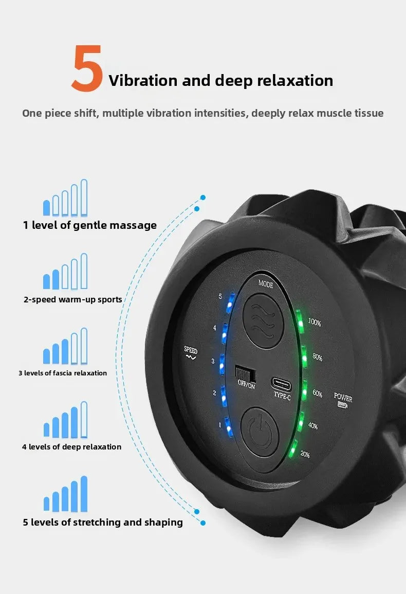 A smart vibrating foam roller made of EVA + ABS, designed to relieve muscle tension, improve recovery, and enhance flexibility with 5 adjustable vibration levels.
